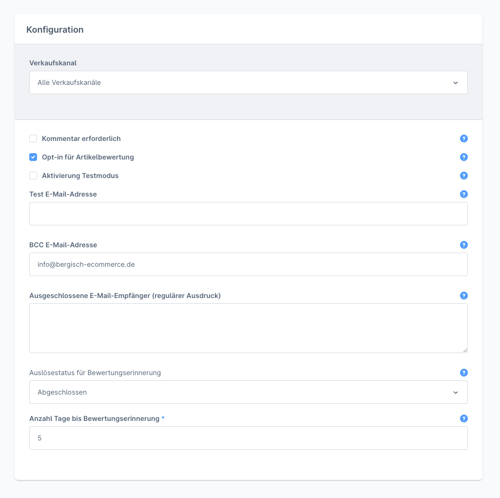 Testmodus, Datenschutzkonform da Kunden per Opt-In der Bewertung zustimmen können, Ausschluss von Empfängern, Auslösestatus und Zeitspanne einstellbar.