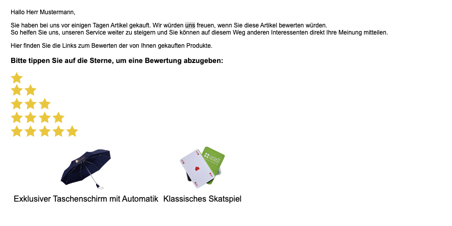 In der E-Mail können deine Kunden direkt die Anzahl der Sterne anklicken, die sie vergeben möchten. Ganz ohne Login und unnötige Umwege gelingt so die Artikelbewertung mit nur einem Klick direkt aus dem E-Mail-Programm heraus.